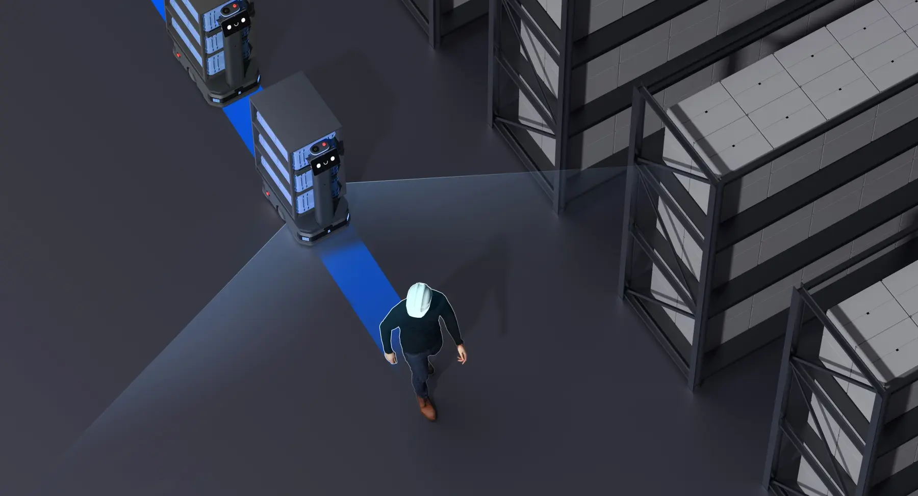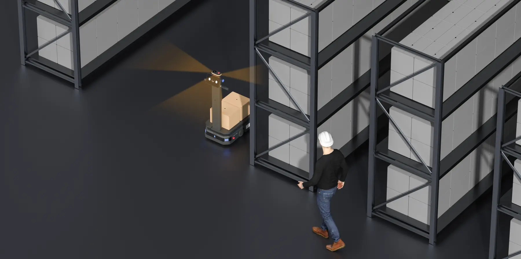 - Visione totale costante, che combina LiDAR e telecamere di profondità per rilevare ostacoli, persone o carrelli da ogni angolazione.