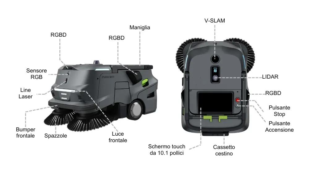 Il PUDU MT1 è equipaggiato con telecamere dotate di intelligenza artificiale, capaci di riconoscere e classificare in tempo reale diverse tipologie di rifiuti. Queste telecamere sfruttano algoritmi di deep learning per apprendere e migliorare continuamente le loro prestazioni, grazie a un costante aggiornamento del database.