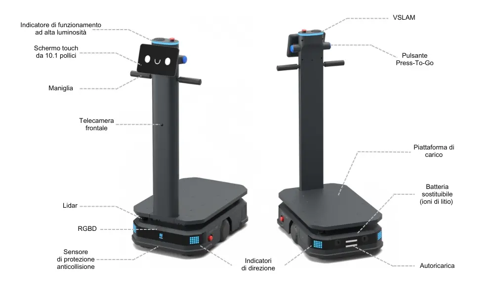 Il robot T300L è progettato per il trasporto automatico di carichi, offrendo soluzioni efficienti e sicure per la movimentazione di oggetti pesanti. Dotato di un sistema di sollevamento avanzato, permette di sollevare, trasportare e posizionare facilmente merci di diverse dimensioni, ottimizzando i processi logistici e riducendo la necessità di intervento umano. Ideale per ambienti industriali e di magazzino, garantisce precisione e affidabilità nel trasporto automatizzato di carichi.